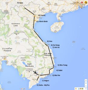 Mašina je diesel s rudou hvěznou, vagóny červenomodré. Jakmile vlak dorazí vrhne se na něj snad celý město, vypadá to jakoby přijel první vlak po x letech. Každý vůz má svého průvodčího který po zasvatení vyvěsí na bok vozu jeho číslo. Naše kupé už je skoro plné, máme variantu „Hard bed“ – horní 2 poslele z celkově 6ti. Klimoška nám funí přímo do obličeje. Jinak vlak vypadá lépe než jsem čekal, co chvíli někdo rozrazí dveře a nabízí polívku, nabíječky, zeleninu .. Spíme, čteme, lenošíme, studujeme Lonely Planet. Cesta utíká celkem rychle i když vlak se loudá a jede šíleně pomalu. Před příjezdem do stanice ji dokonce amplión ohlásí i anglicky, z toho jsem pif paf. Po 11ti hodinách jsme v DaNangu (urazili jsme cca 550km).